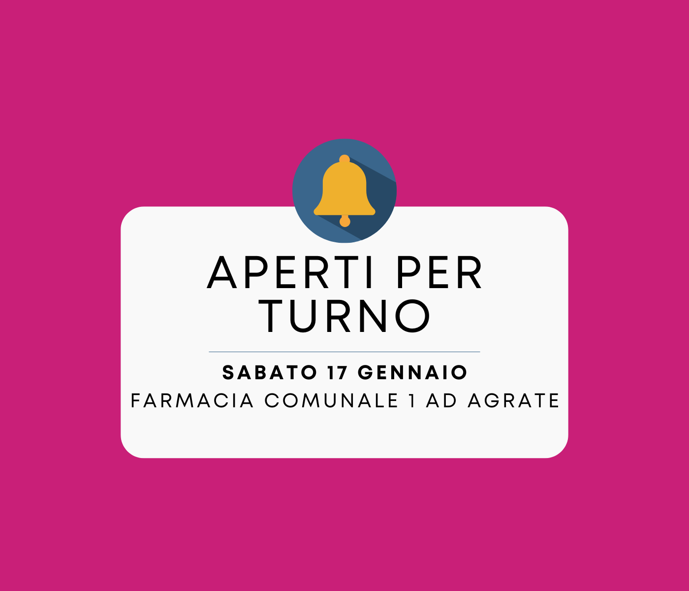 Sabato 17 gennaio la Farmacia Comunale 1 ad Agrate sarà di turno dalle 8:30 fino al giorno successivo.